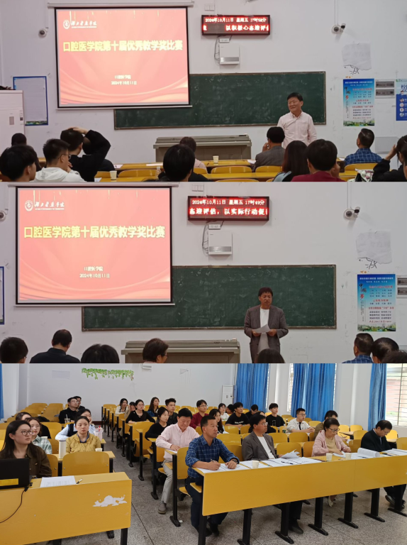 (通讯员 陈梦晓)10月11日下午,口腔医学院在5号教学楼5113教室举办了第十届优秀教学奖比赛,口腔一系、二系、三系通过系内选拔,推出9名教师来院参赛。由校教学督导专家组组长李文春教授、校教学督导专家朱名安教授、口腔医学院秦赤子书记、口腔一系罗志晓主任,口腔二系任伟伟主任,口腔三系郑钧元主任6位老师担任评委,10名学生代表担任学生评委。
