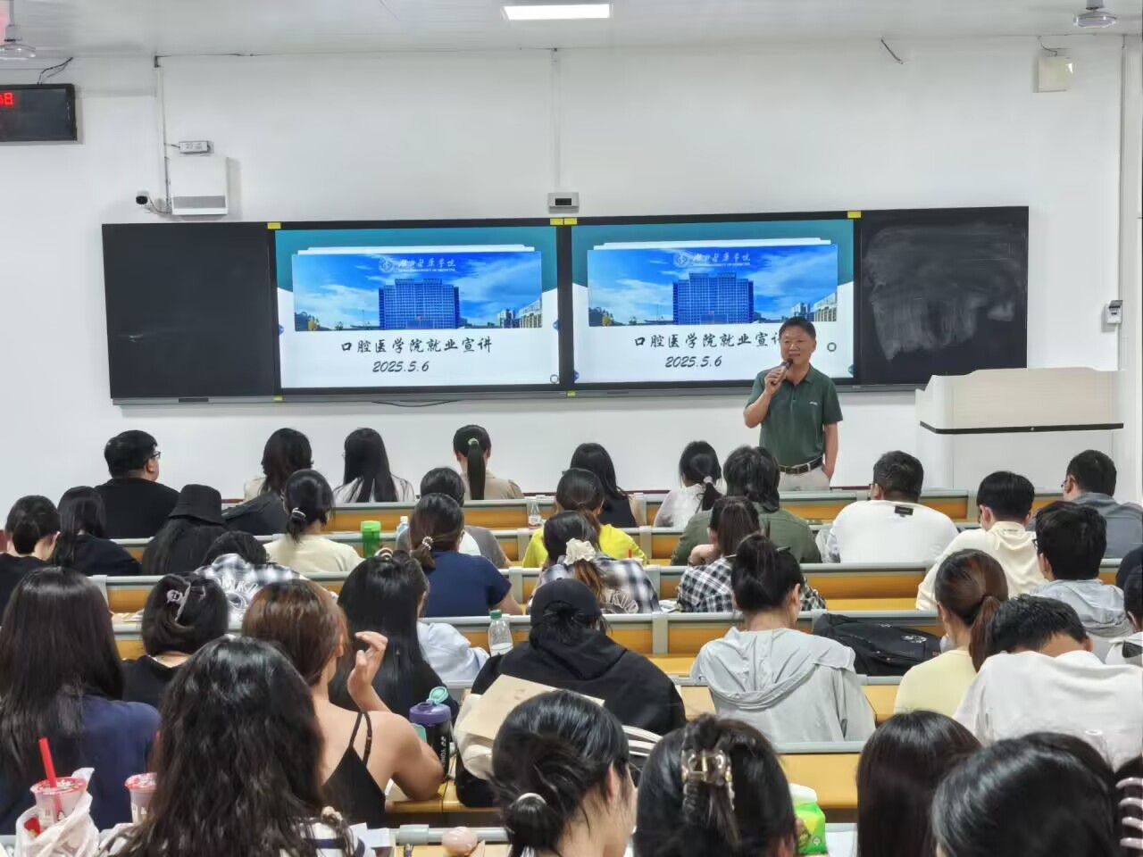 (通讯员 徐萍萍)2025年5月6日下午,口腔医学院在3301教室举办2025届口腔毕业生就业宣讲会。口腔医学院党委书记秦赤子、副书记吴卉、继续教育学院同等学力申硕办喻遵齐老师、学院全体管理干部及毕业班全体学生参会。