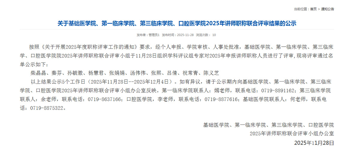 关于基础医学院、第一临床学院、第三临床学院、口腔医学院2025年讲师职称联合评审结果的公示